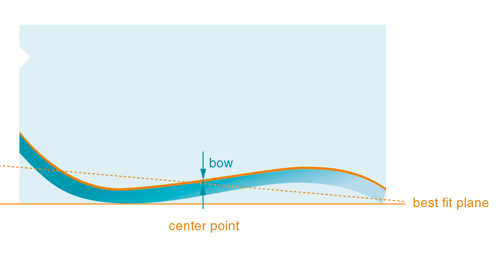 Bow指晶圆在未紧贴状态下,晶圆中心点表面距离参考平面的最小值和最大值之间的偏差,偏差包括凹形和凸形的情况,凹形弯曲度为负值,凸形弯曲度为正值;一般以微米(μm)表示,一般表达形式如:-15~15µm。